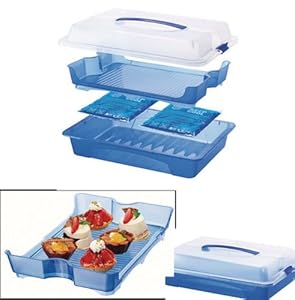 Product Description : Party Platter, Server, Sandwich, Deli Meats and Food Carrier, Cool and Fresh Rotho; a Swiss company has come up with an ingenious way to ensure that food arrives at the party cool and fresh. The cooling feature in this container keeps cup cakes, deli sandwiches, veggie sticks, and other foods cool till you are ready to serve them. The party platter is also a food server, remove the top and it becomes a platter from which you can serve. It comes with two cooling packs which are stored in its own compartment and keeps food cool till you are ready to serve. Just freeze the cooling packs, and place the packs in its separate compartment in the unit. The length of time it remains cool depends on the outside temperature. This feature will keep those culinary disasters from happening to you. The upper lid locks into the platter and it has a carrying handle. Generously measures about 17 inches x 11 ? inches x 4 ? inches. Features: Keeps cup cakes, deli sandwiches and other delicacies cool and fresh. Swiss Made, attractive looking made of quality polypropylene. The Party Platter has a handle for easy transport. Use indoors, patio or outdoors. Measures about 17 inches x 11 ? inches x 4 ? inches.